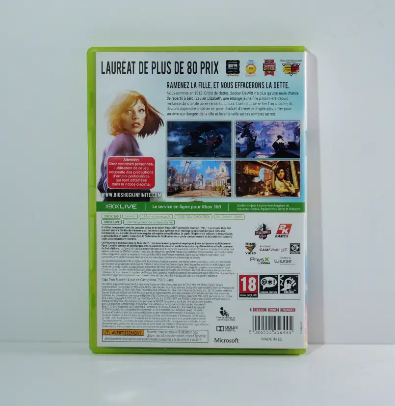 Bioshock Infinite sur Xbox 360 est un jeu d’action à la première personne. Le titre entraîne le joueur en 1912 et le glisse dans la peau de Booker DeWitt, homme de main et détective endetté. Sa mission consiste à ramener à New York une jeune femme manifestement retenue dans Columbia, une mystérieuse ville flottante. On utilisera pour cela un arsenal varié ainsi qu’une palette de pouvoirs baptisés Toniques.