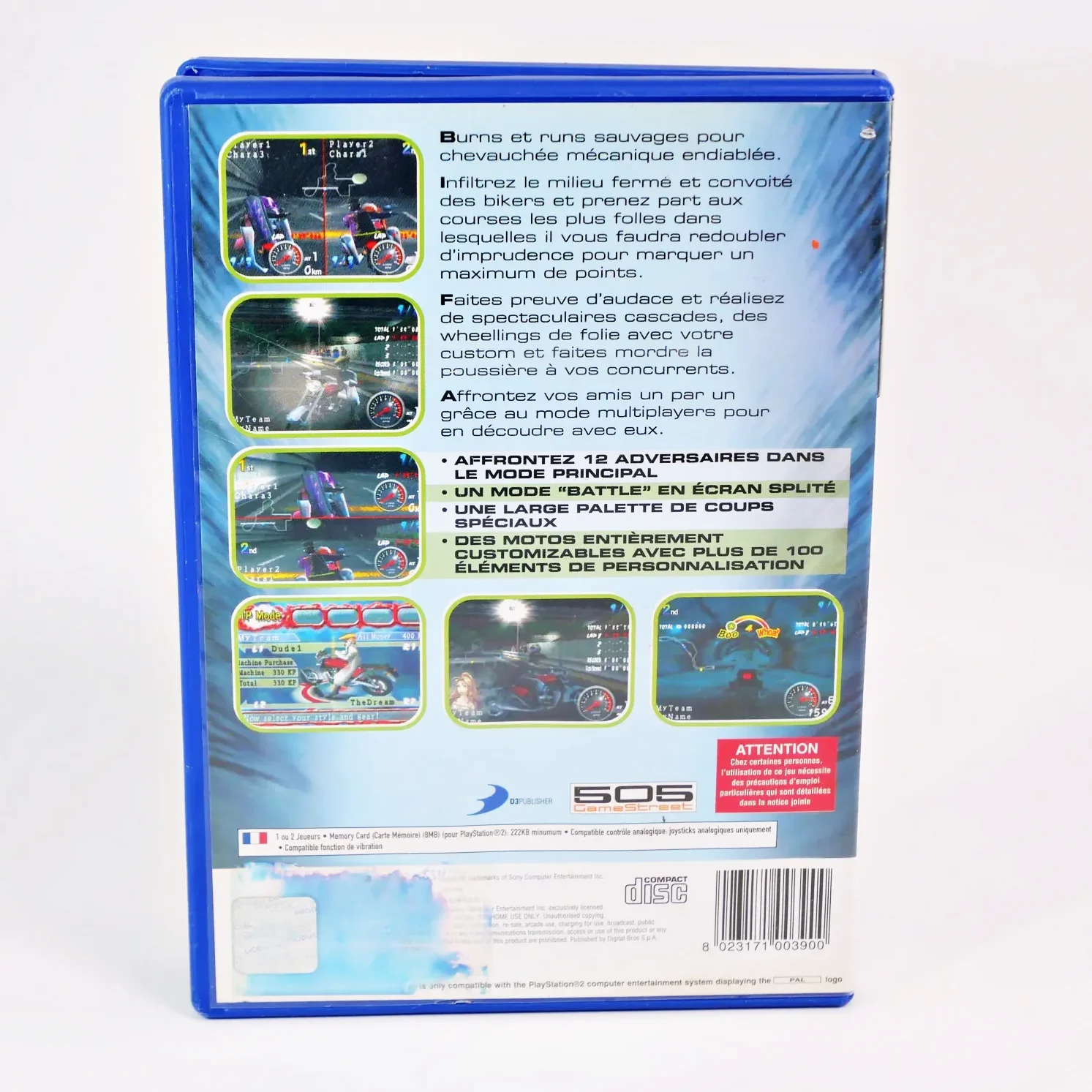 Motorbike King sur PS2 est un jeu de courses urbaines où vous prenez le contrôle d’un biker qui devra enchaîner les courses contre un adversaire afin de gagner de l’argent pour customiser son cyclo. 12 bécanes sont disponibles, ainsi que la possibilité d’upgrader son bolide, le décorer, modifier le look du biker ou recruter des membres pour son équipe, comme par exemple des groupies.